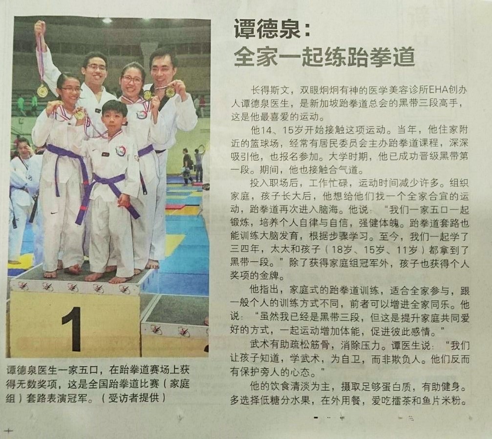Our pride, the Tam family, interviewed by the local Chinese papers,早报 , on the family practising taekwondo together.